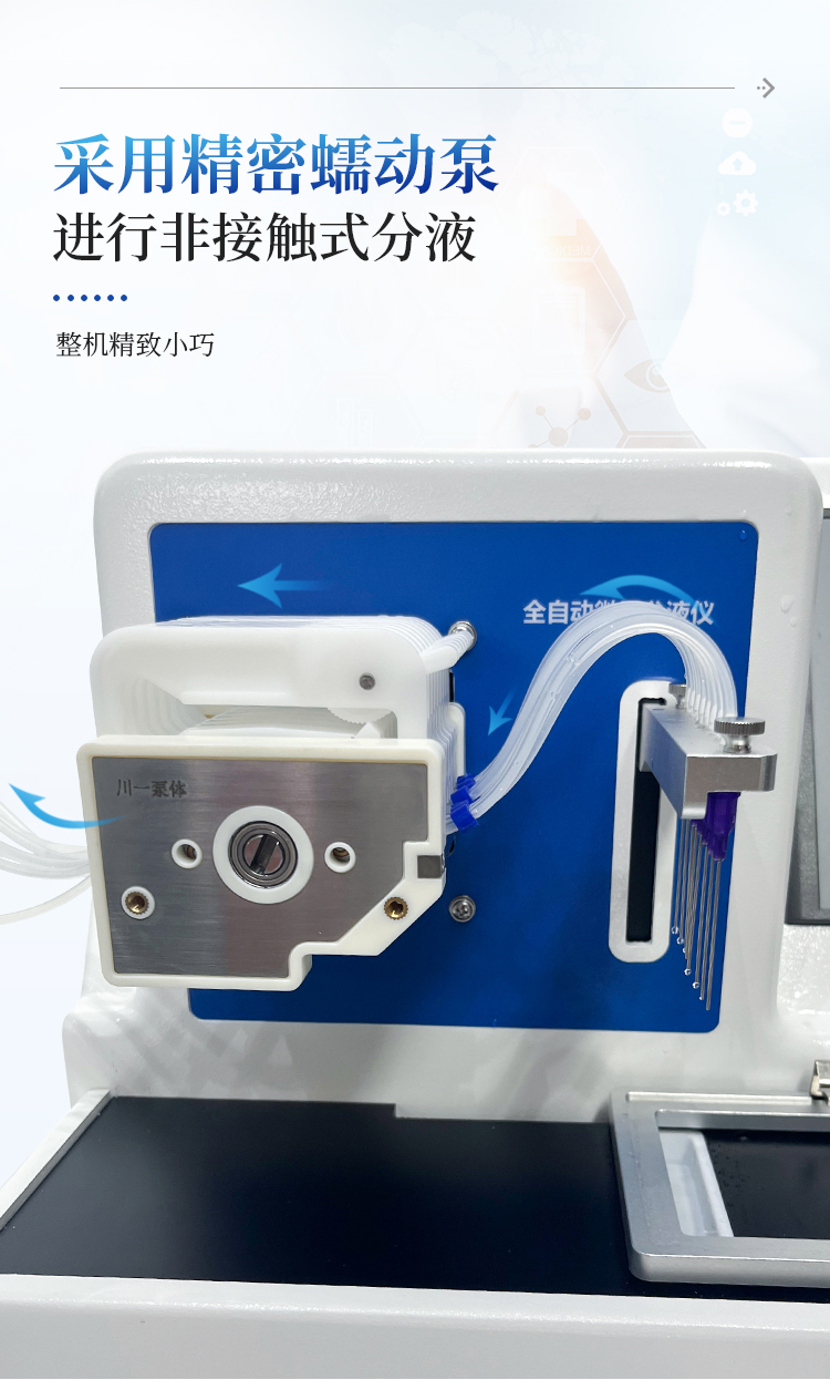 1、全自动微量分液仪采用精密蠕动泵进行非接触式分液,整机精致小巧;