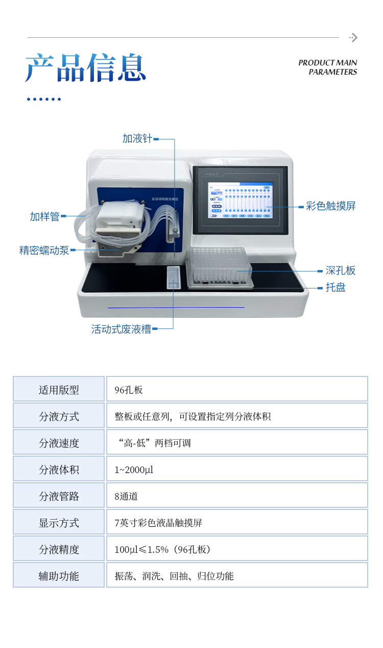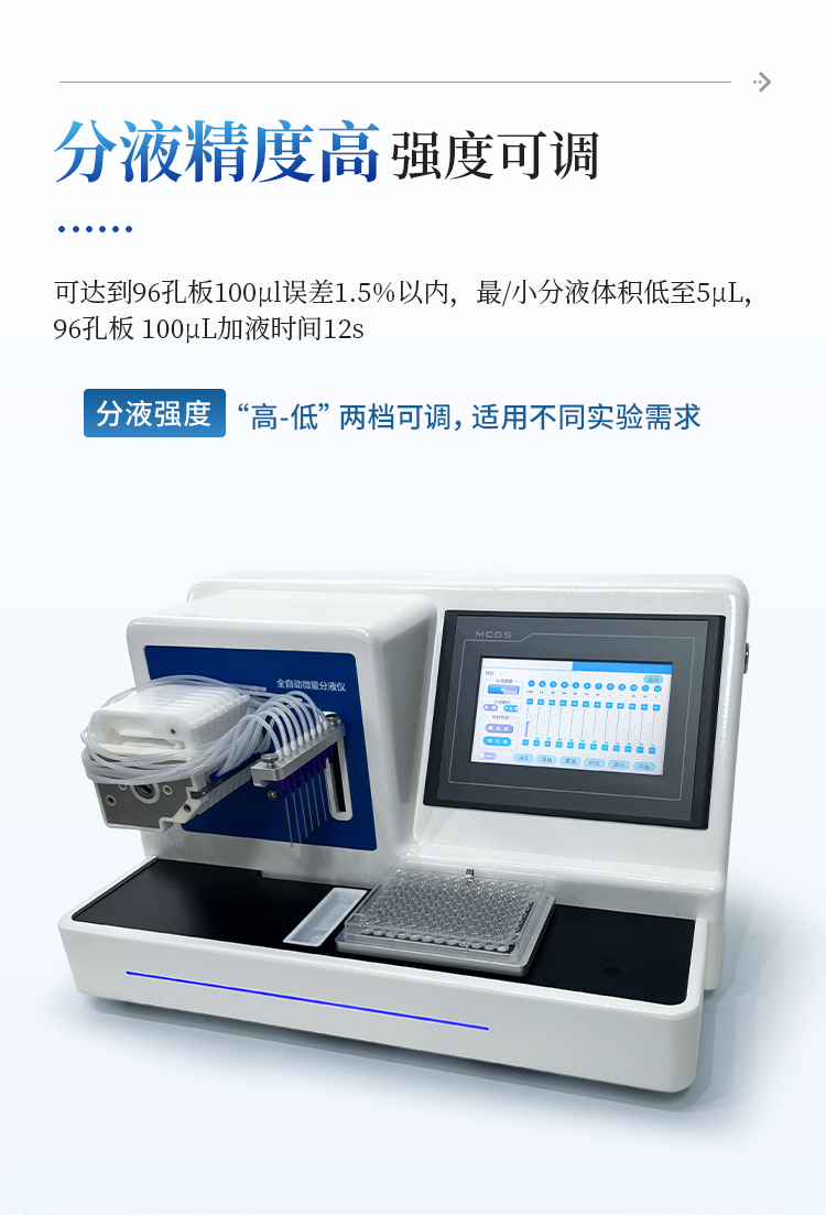 简要描述: 全自动微量分液仪是一种配备高精度蠕动泵的分液设备,能够快速、精确、一致的完成自动化分液操作。可广泛应用于疾控筛查、食品检测、动物检疫、生命科学研究等领域。解放实验员双手,在提高效率的同时避免错误。