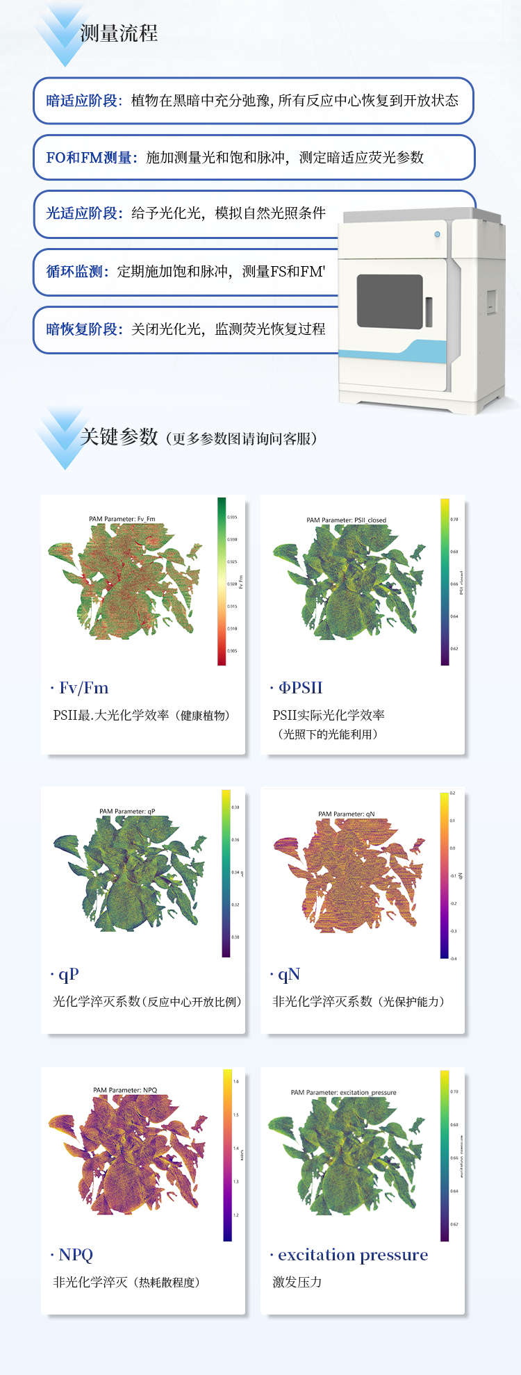 测量原理: 暗适应后的植物叶片在强光照射下,PSII反应中心QA从氧化态逐渐被还原,导致荧光强度快速上升。这一过程反映了电子传递链的效率和PSII反应中心的数量与活性。