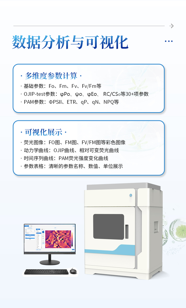 简要描述: 叶绿素荧光成像仪是一款专业的植物光合作用研究仪器,采用高灵敏度CMOS相机和LED光源控制,实现对植物叶片叶绿素荧光的快速、无损检测与成像分析。系统集成了OJIP快速荧光动力学测量和PAM调制荧光测量两大核心功能,能够全面评估植物光合系统的活性、光能利用效率以及环境胁迫响应。